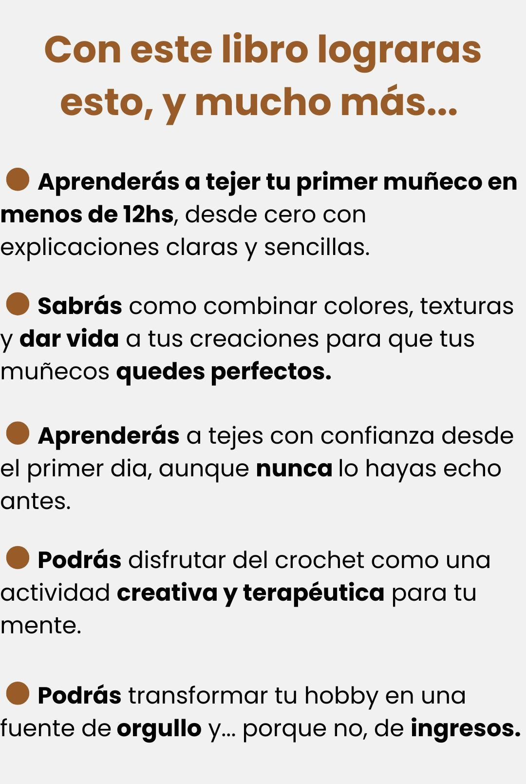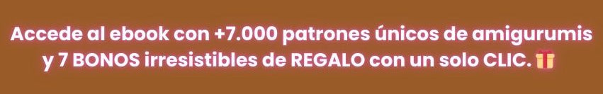 Incluye una guía completa para hacer tu primer amigurumi en 12hs, +7.000 patrones hermosos, y 7 bonos exclusivos para ayudarte a crear, organizarte y empezar a vender.